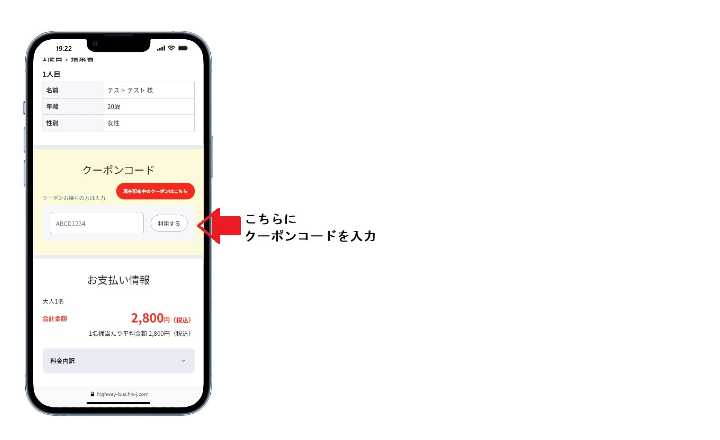 ご予約を進めていただくと、予約内容確認ページに「クーポンコード」の欄が表示されます。